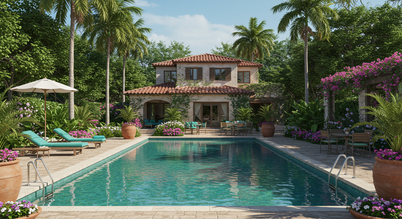 An old serpentine wall triggers curiosity as it wends its way along the road. It seems to enclose an ancient grove and as we enter we find indeed a mature garden revealing romantically the history of the Marquez Rancho hacienda that once occupied these grounds. The stone-paved loggia leads us to the main house designed in the 1920s by John Byers, famous for his reconstructions of Colonial Mexican architecture with undulating adobe and plaster walls. Inside the two-story foyer beckons us immediately into the vaulted beamed living room with its massive hearth and quick acoustics. The arcaded veranda off the living room embraces the huge courtyard paved in encaustic tile as it approaches the oversized pool. A giant sycamore provides a canopy while giant birds of paradise and bougainvillea give off a quiet aroma of maybe a forgotten era. Nearby a grotto, pond, and stream gurgle. Additional structures include a chapel, theater, three casitas, two studios, an outdoor bar & fireplace, and a sports court.