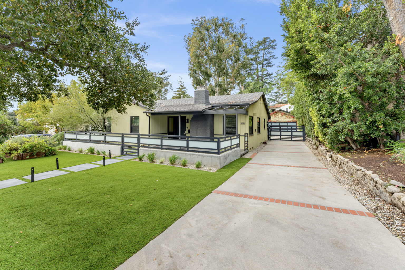 Located in one of the most desirable neighborhoods in Altadena and just steps from Eaton Canyon where you can enjoy hiking, horseback riding and taking your dog for a walk. This home boasts the “Grandest” oak tree on Grand Oaks Avenue, and it makes for a magnificent landmark when lit-up at night. Custom iron and glasswork provide an exquisite modern look to this mid-century home as they round out the courtyard where you can take in the incredible mountain views. The large living room with a functioning gas fireplace and office space is a great dual-purpose space. The dining area has an in-wall fireplace feature and is adjacent to the kitchen and den creating a desirable open concept living/entertaining area. Bathrooms are fully remodeled with custom floating cabinetry, quartz countertops, and high-end fixtures. Both the front and backyard have been updated to synthetic turf and drip irrigation for water conservation as well as LED landscape lighting to save on electricity. Mature trees and foliage create a backyard oasis where there are three entertaining areas, a covered patio right off of the den with a ceiling, a large open patio that is rough plumbed with hot and cold water, waste and gas for a future outdoor kitchen as well as additional fire features, and lastly a sitting area under a wispy tree to catch up on a good book at the very rear of the property.