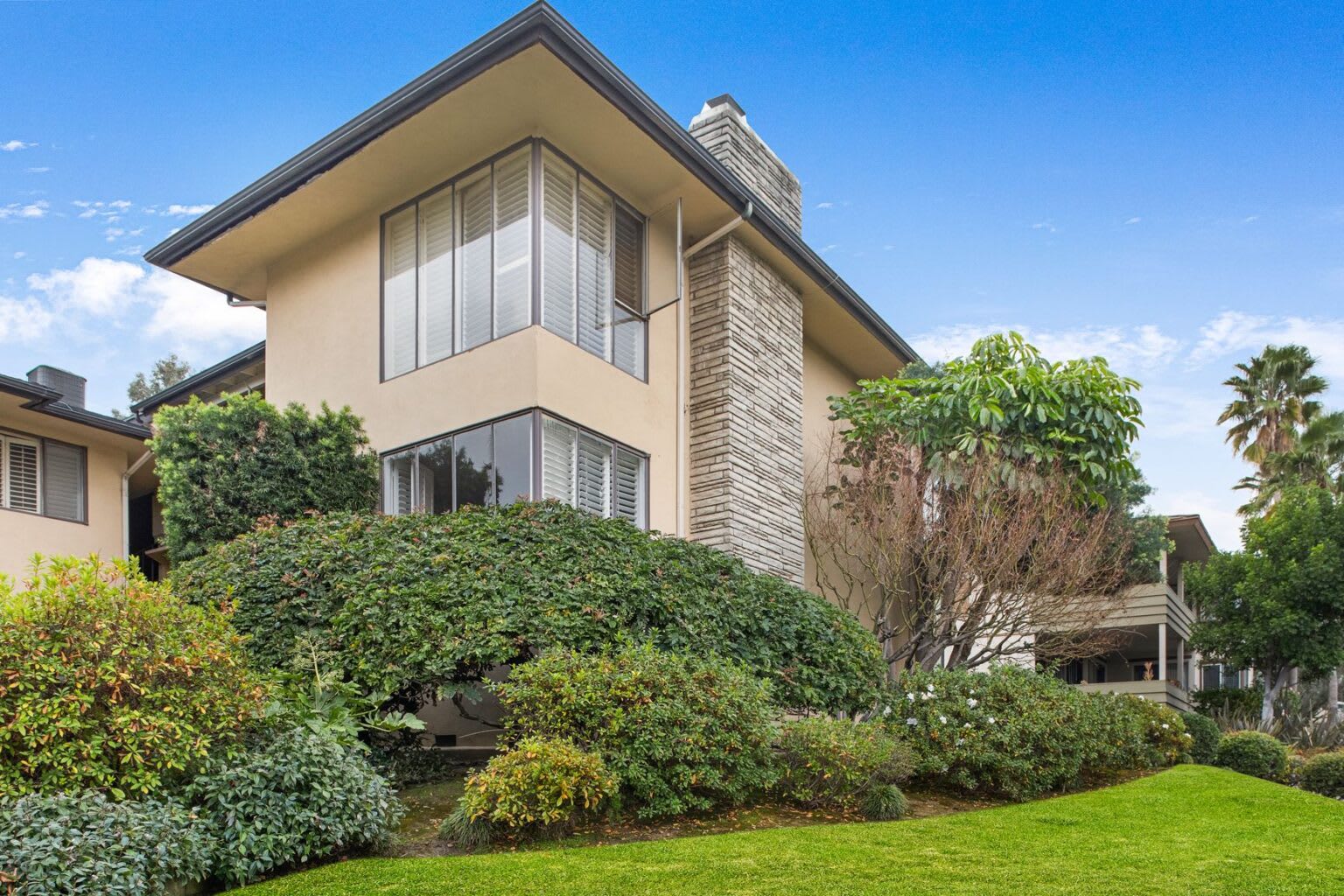 Located just south of distinguished early 20th century homes including the Gamble House and Wrigley Mansion on ‘Millionaire’s Row’ is the mid-century modern condo building where this unit is for sale. Set back from the boulevard, the building consists of 5 two-story pavilions, each with two units, that are surrounded by gardens. A pool and bbq area are in the center. All units are accessed by covered exterior circulation. The pavilions ascend from Orange Grove up the hill to its west, providing each unit views of the San Gabriel mountains beyond. Unit D is accessed through a private patio. Beyond lies a gracious living room with a fireplace and floor to ceiling, steel frame corner windows with a beautiful view of the mountains. The social spaces and bedrooms feature handsome wood floors. A formal dining room leads to a recently renovated kitchen with clean, tasteful finishes and updated appliances.