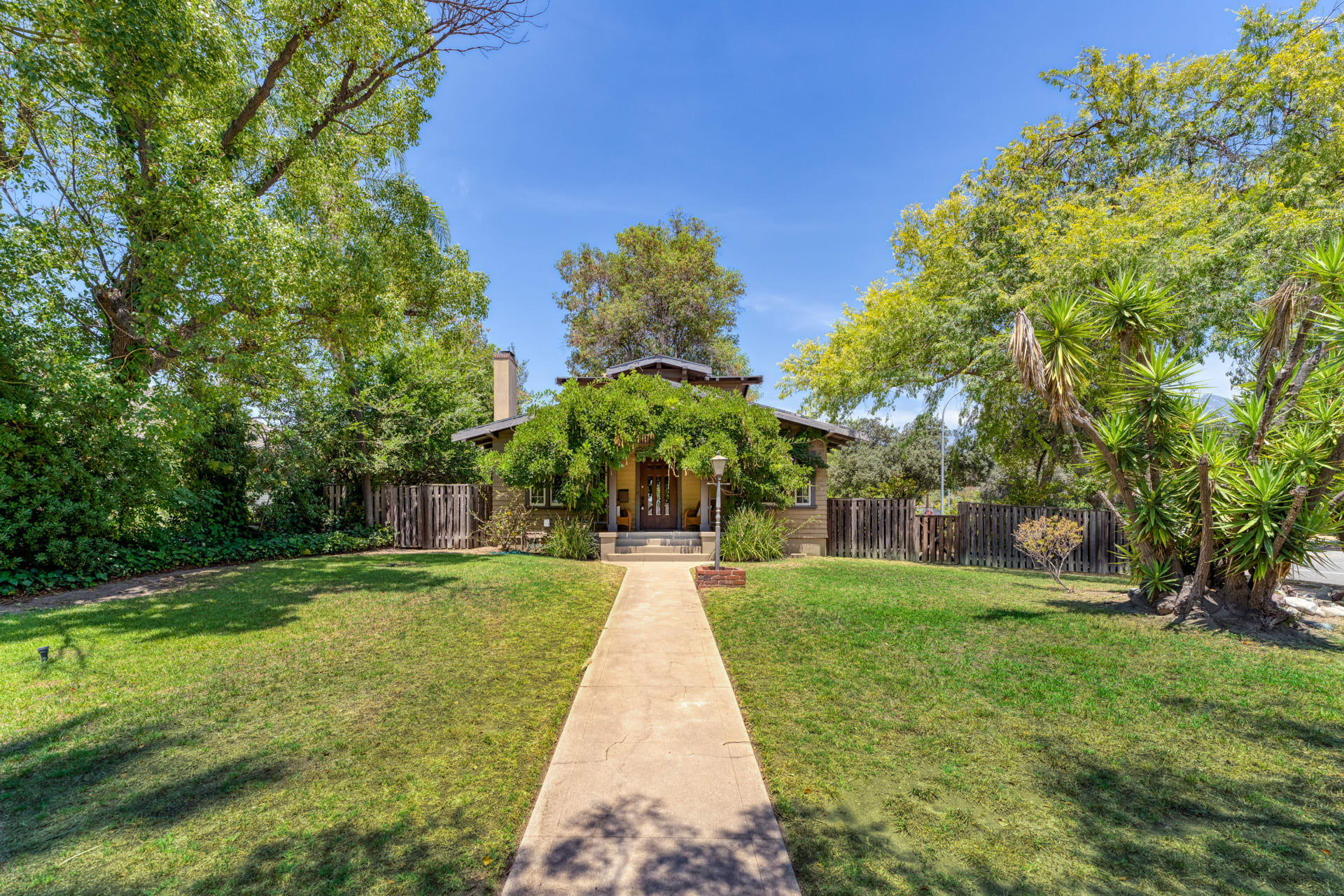Aptly known as The Terrell House to local architecture and design aficionados, the home at the corner of 1799 Loma Vista St. presents itself as a small memento of Pasadena cultural history with a rich background to match. Designed/ built in 1921 by California native Harry Terrell. this home is an awesome example of an Airplane Bungalow with classic craftsman features. The second story of the home sits like a cockpit above the first story roof, spreading like wings about to take flight. Coupled with large mature trees, wood siding, and a striking wisteria this home is beautiful as it is special. Formal living room with hardwood flooring, mahogany woodwork throughout including crown molding, and of course, no historic Pasadena home would be complete without a Batchelder tile fireplace. A large formal dining room offers a built-in buffet and cabinets as well as original leaded glass windows. Highlighting the main level are the unique built-in lawyer bookcases and fold-down desk in the library. Curl up with a book or conduct business in this dreamy space filled with character and period charm. Two bedrooms/ two bathrooms along with a bright, kitchen and laundry room complete the first floor while the second level belongs to the en-suite primary bedroom alone. The 458 SF, one bedroom, 1 bath, living area, and kitchen complete guest house. With loving restoration, this house can showcase its true character and pedigree.
