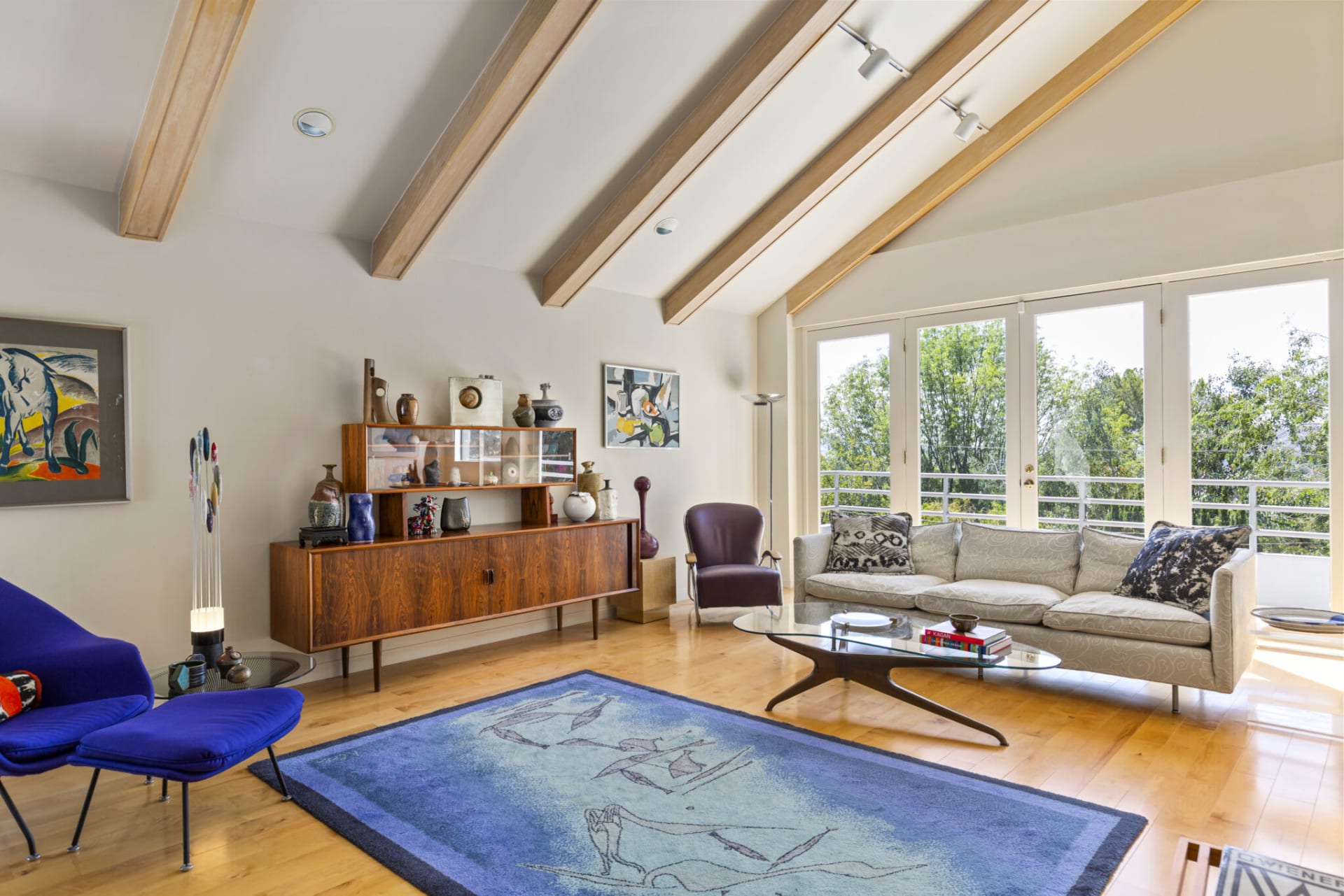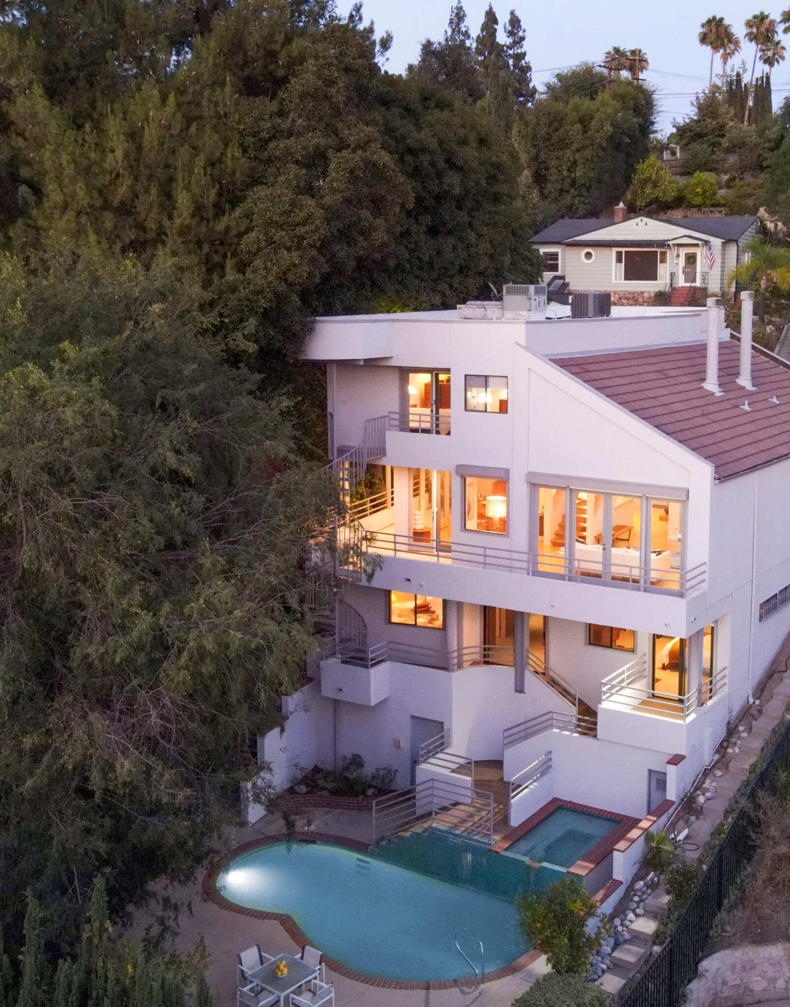 Designed by Argenta Architects, 1989, this dramatic contemporary home in the San Rafael Hills of Pasadena has panoramic city and mountain views. Tastefully updated, 3 stories, with a multi-person elevator that provides easy access to all areas, the dramatic two-story entry leads to an open floor plan that reveals architectural leaded art glass, a floating staircase surrounded by the living and dining rooms which feature wood beamed high cathedral ceilings and walls of glass opening to wrap-around balconies. The sleek custom kitchen is outfitted with an island and peninsula, Quartzite countertops, designer stone backsplash, a complete Miele Appliance Package that includes 2 dishwashers, a refrigerator, microwave wall speed oven combo, wine fridge, induction cooktop, hood, fan, and bread warmer. There is a walk-in pantry and wine cellar. There are 4-ensuite bedrooms, the primary features double closets, an updated sleek primary bathroom with Silestone countertops, and Carrera marble floors. Other features include 2 fireplaces, maple hardwood floors, wood paneling, wood built-ins, recessed LED lighting, several outdoor areas for entertaining, pool and spa, an attached garage, full laundry room, abundant storage, automatic irrigation, outdoor lighting, and a fenced in yard and security system. A well-appointed designer contemporary home that captures sunlight and views from every angle.